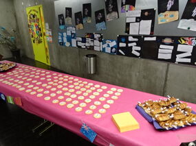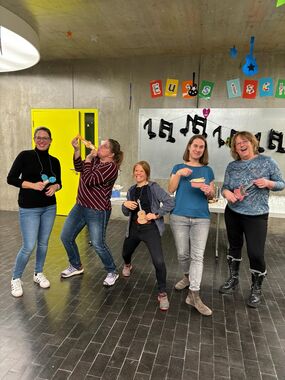 Während die Kinder der ersten Geschichte lauschen, huschen wir Frauen wie Heinzelmännchen durch das Foyer, es heisst möglichst schnell und schön das Pausenbuffet aufzubauen. Kaum fertig purzeln schon die ersten Kinder aus den Zimmern. Nach und nach füllt sich der Eingangsbereich und die Muffins, gebackenen Musiknoten, Gitarren und Notenschlüssel scheinen sich in Luft aufzulösen. Auch die soeben gesteckten Fruchtspiesse schwinden in Windeseile. Nach einer halben Stunde ist der Spuk vorbei, und die Kinder und Lehrpersonen verschwinden wieder in den Klassenzimmern. Nur fünf einsame Muffins haben den Ansturm überlebt, diese werden nun zusammen mit den Platten weggeräumt. Besen werden hervorgeholt und Putzlappen geschwungen.