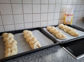 Da der Elternbesuchstag zum wiederholten Mal ausgefallen ist, und die Schüler auch auf das jeweilige Pausencafé verzichten müssen, wollten wir den Kindern wenigstens eine kleine Freude machen. Wir (der Vorstand des Elternforums) haben 14 kg Zopf gebacken, welche wir dann am Morgen für den Znüni in die Schule gebracht haben.