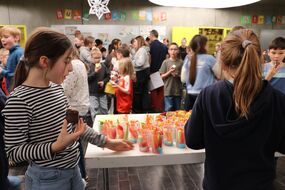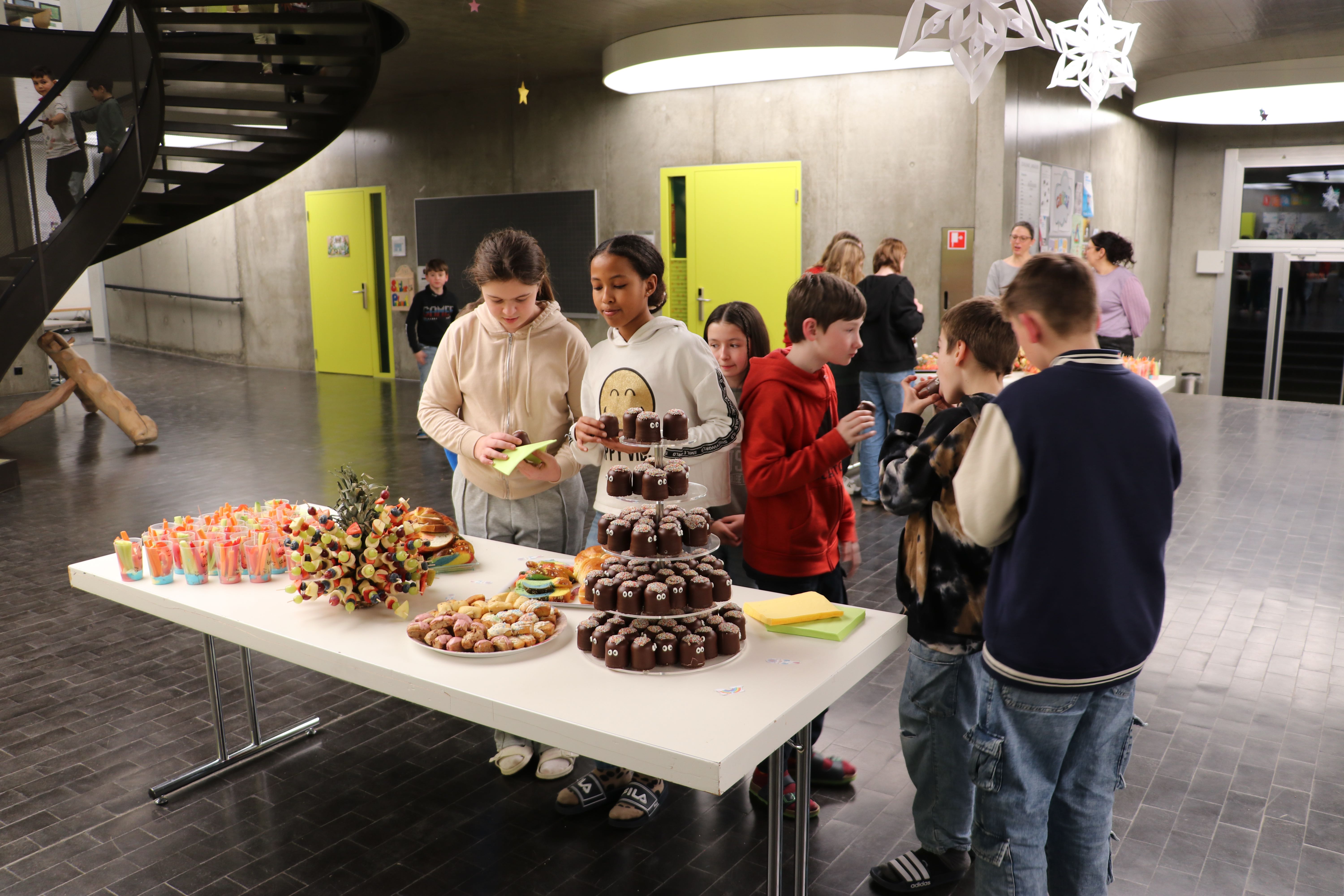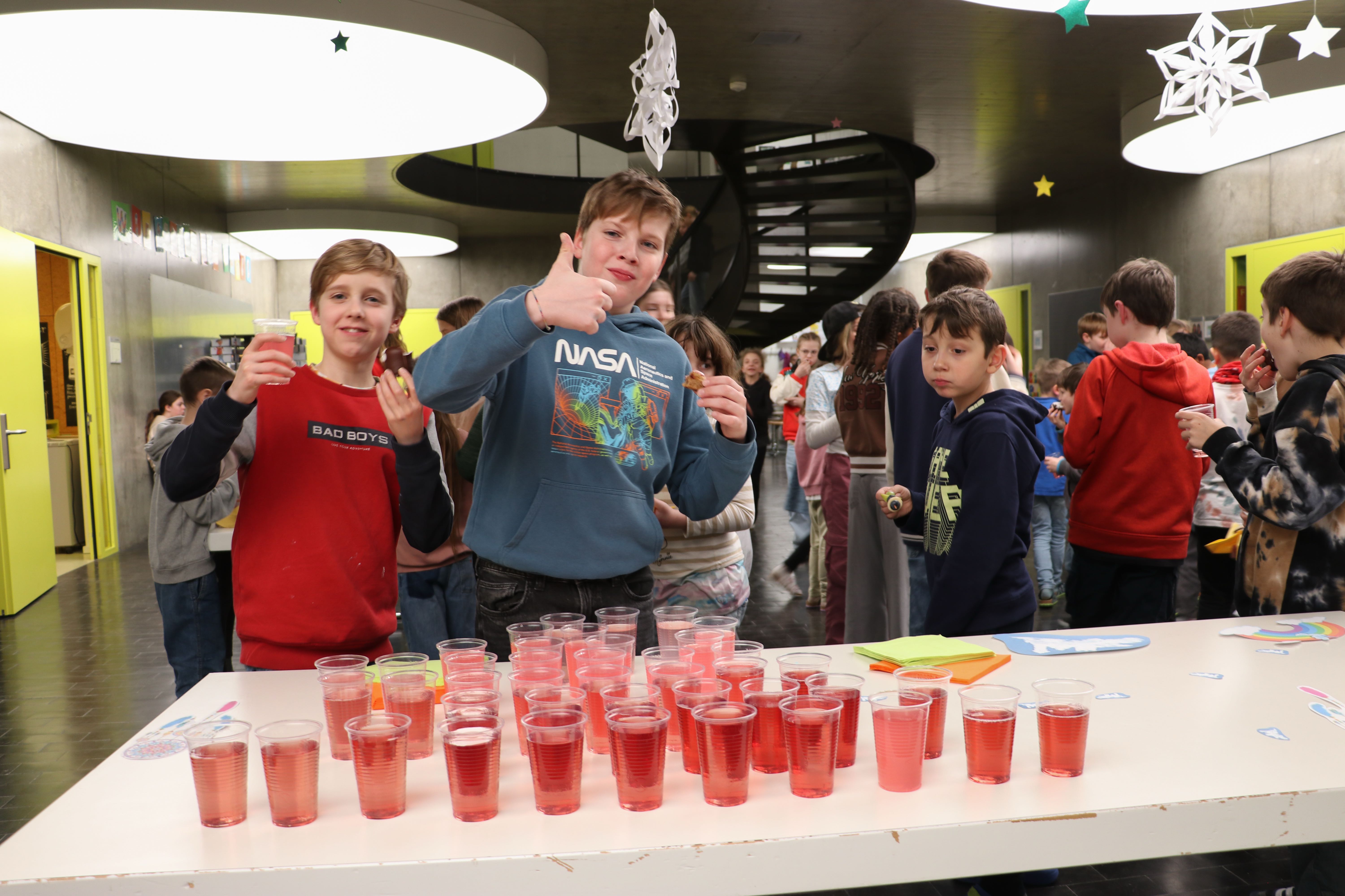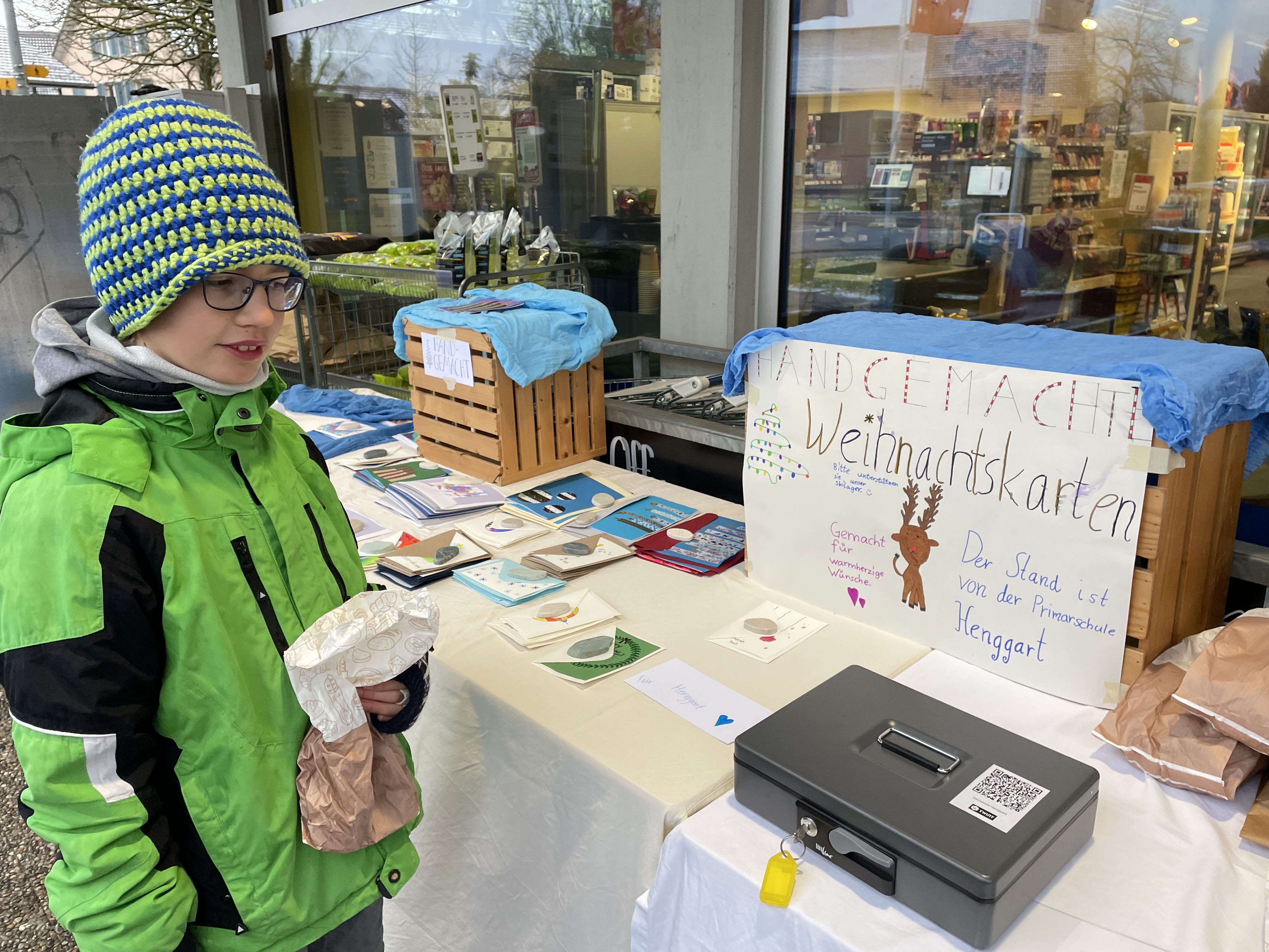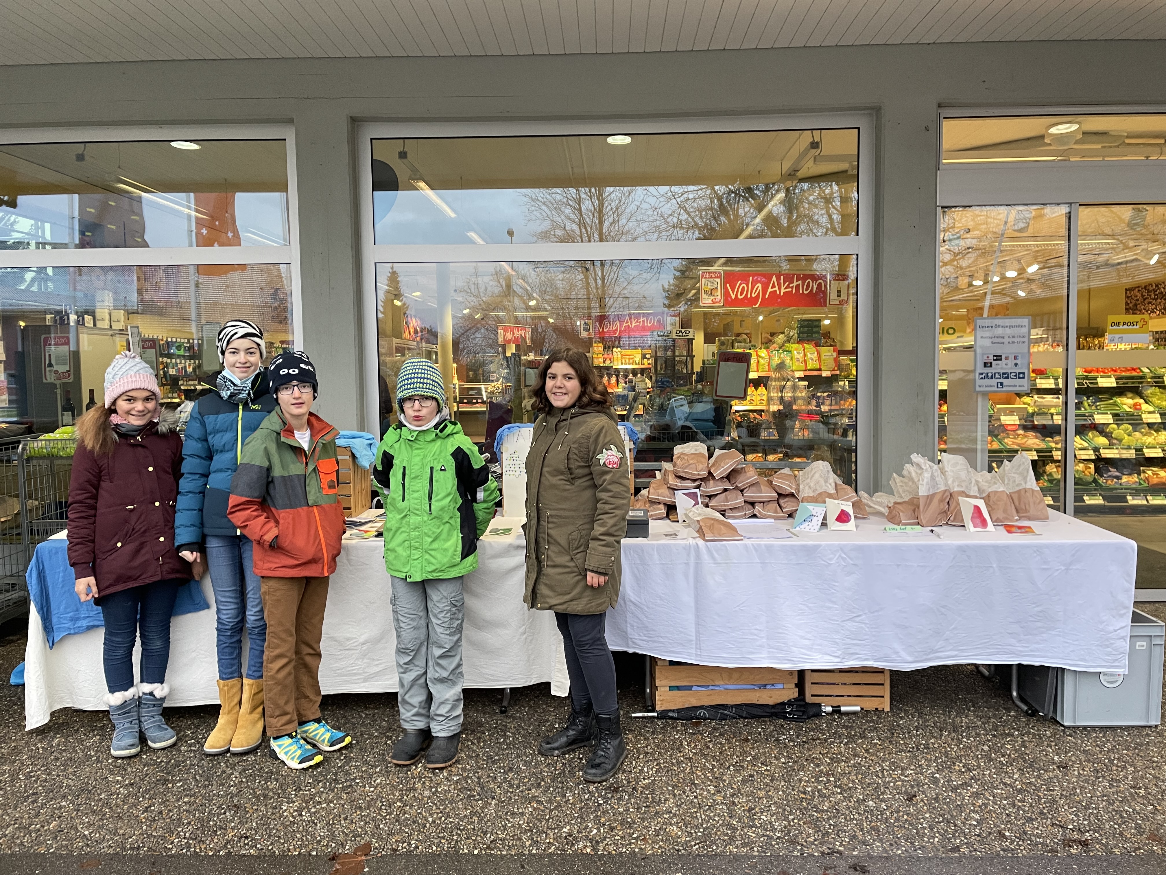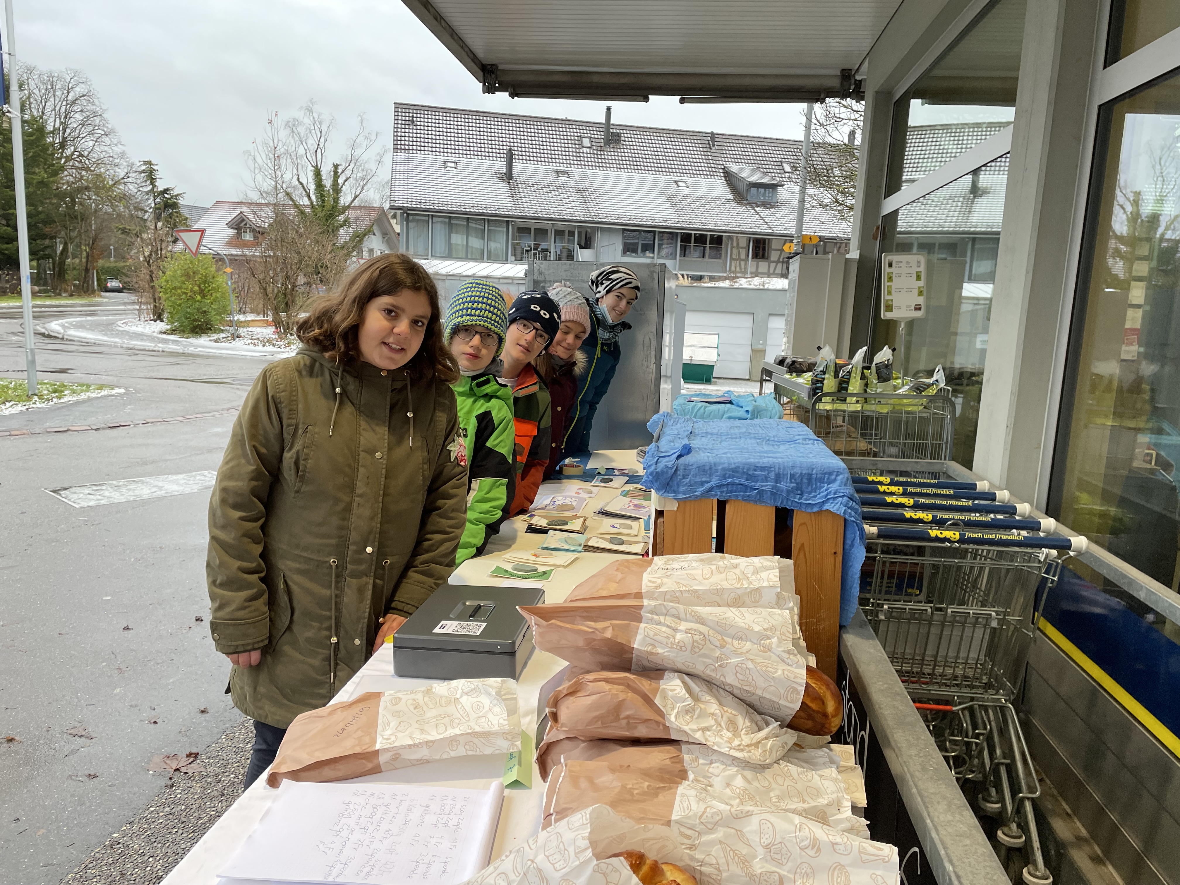 Normalerweise betreiben wir das Elternkaffee an den Besuchstagen, um Geld für das Skilager der 5. und 6. Klässler zu sammeln. Die Schüler der jeweiligen Klassen backen dann Zopf, den wir verkaufen. Da das aufgrund von Corona bereits letztes Jahr, und auch dieses Jahr nicht möglich war, haben wir uns überlegt wie wir dieses finanzielle Loch stopfen könnten. So ist die Idee entstanden, anfangs Dezember einen Verkaufsstand vor dem Volg zu organisieren, an dem die Schüler mit uns zusammen selbst gebackenen Zopf und selbst gebastelte Weihnachtskarten verkaufen können. Die Aktion war trotz des garstigen Wetters ein voller Erfolg, wir haben alle Zöpfe und viele, viele Weihnachtskarten verkauft. An dieser Stelle möchten wir uns ganz herzlich beim Volg Henggart, für die Bereitschaft uns den Vorplatz für den Stand zur Verfügung zu stellen, bedanken! Und natürlich auch bei den Lehrpersonen, dem Skilagerteam und Marius Strebel, die uns alle tatkräftig unterstützt haben! MERCI!